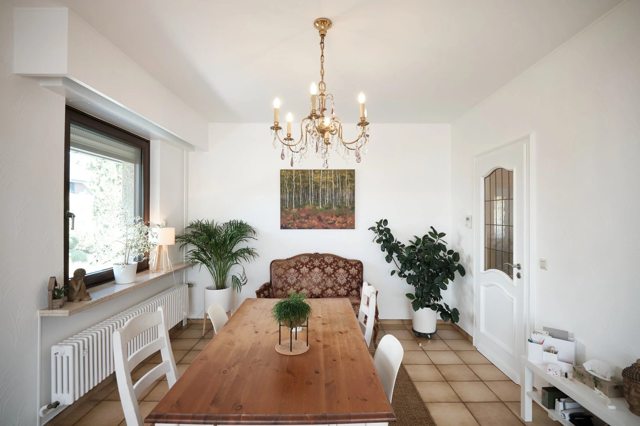 Am klengen Entréesberäich kënnt Dir a Rou ukommen an duerch de symboleschen a bewossten Akt vum Schong ausdoen all negativ Energie, de Stress an d'hektesch Realitéit vum Alldag ofleeën. Sou kënnt Dir mat engem propperen a fräie Geescht am Addendum ukommen, an – ganz praktesch – mathëllefen, d'Haus propper ze halen. Dir gitt dann direkt an d'Häerzstéck vum Haus: déi hell an oppen Salle d'Attente, wou de grousse Lüster an déi zwee grouss Kiischtebléien-Biller ee Gefill vu Gebuergenheet a Rouh vermëttelen.